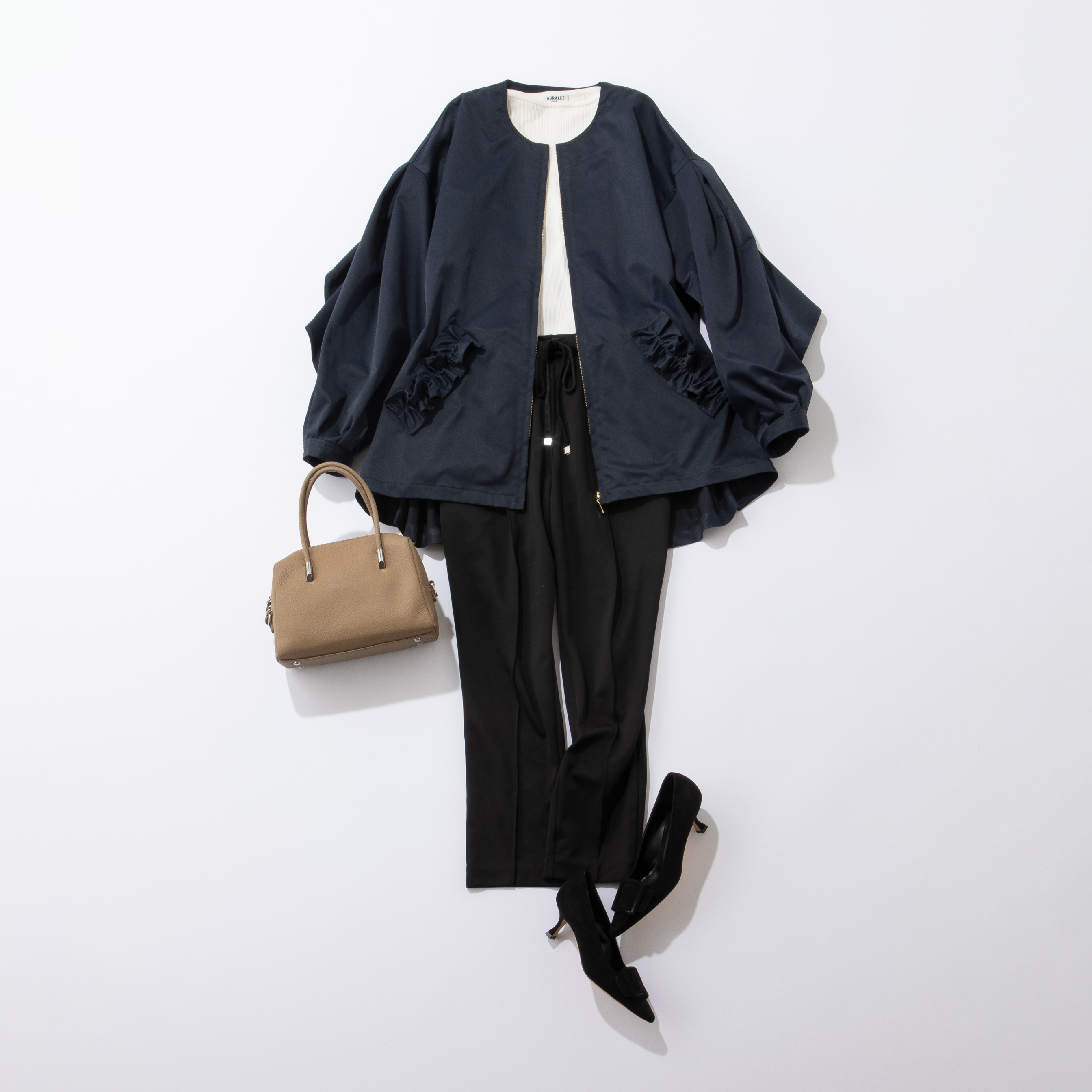背中の大胆なフリルが華やかながらも、前から見るとシンプルできちんと感のあるアウター。黒パンツ×白インナーのシンプルなコーデにも羽織るだけで、サマになり園行事にもぴったりな自信を持てる着こなしに。ベージュのバッグを合わせて、さりげなく春らしい軽やかさを意識。おしりまですっぽり隠れる丈やAラインのシルエットで体型カバーもできる優秀な一枚です。