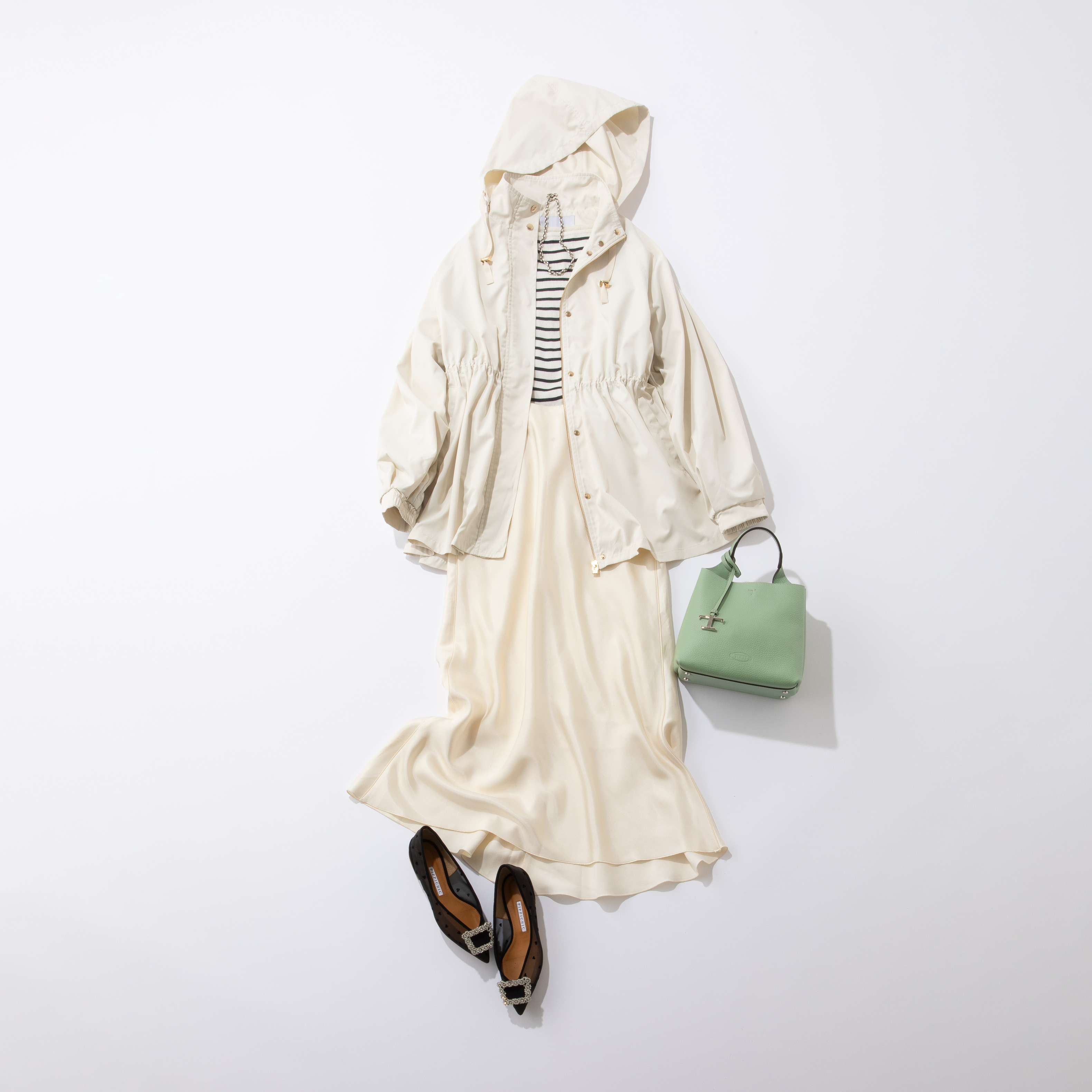 カジュアルながらもゴールド金具の品の良さでこなれ感のあるマウンテンパーカーは、その日の予定に合わせてきれいめにもカジュアルにも楽しめる万能性が◎。ツヤのある生地が華やかな印象に導いてくれるサテンのスカートを合わせて、グッと洗練された大人の着こなしに。ボーダー柄のインナーを合わせれば、のっぺり見えがちなワントーンコーデにリズムが生まれ、ほどよい抜け感を演出します。バッグはカラーものを合わせて春らしいアクセントに。