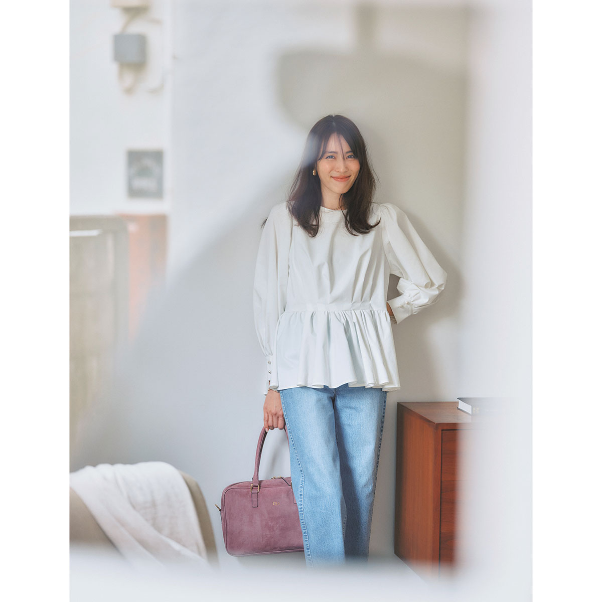 ブラウス¥18,700(スリースクエア)デニムパンツ¥27,500(アッパーハイツ/デミルクス ビームス 新宿)イヤリング¥8,800(アビステ)バングル¥36,300(アナプノエ/フォーティーン ショールーム)バッグ¥44,660(テラ/ティースクエア プレスルーム)