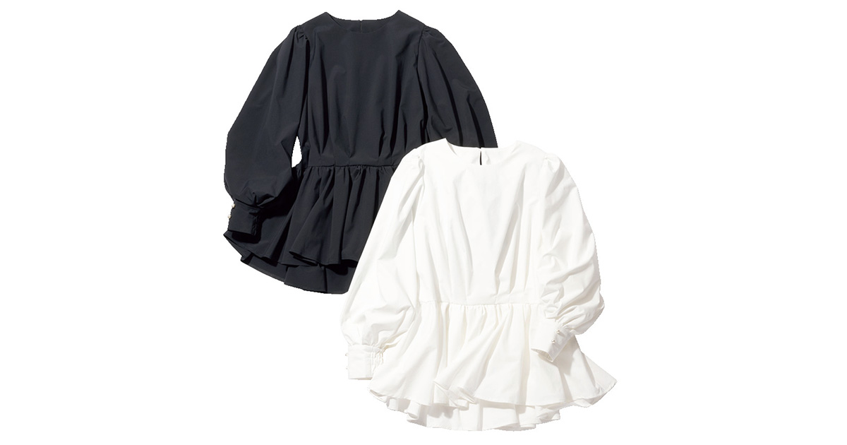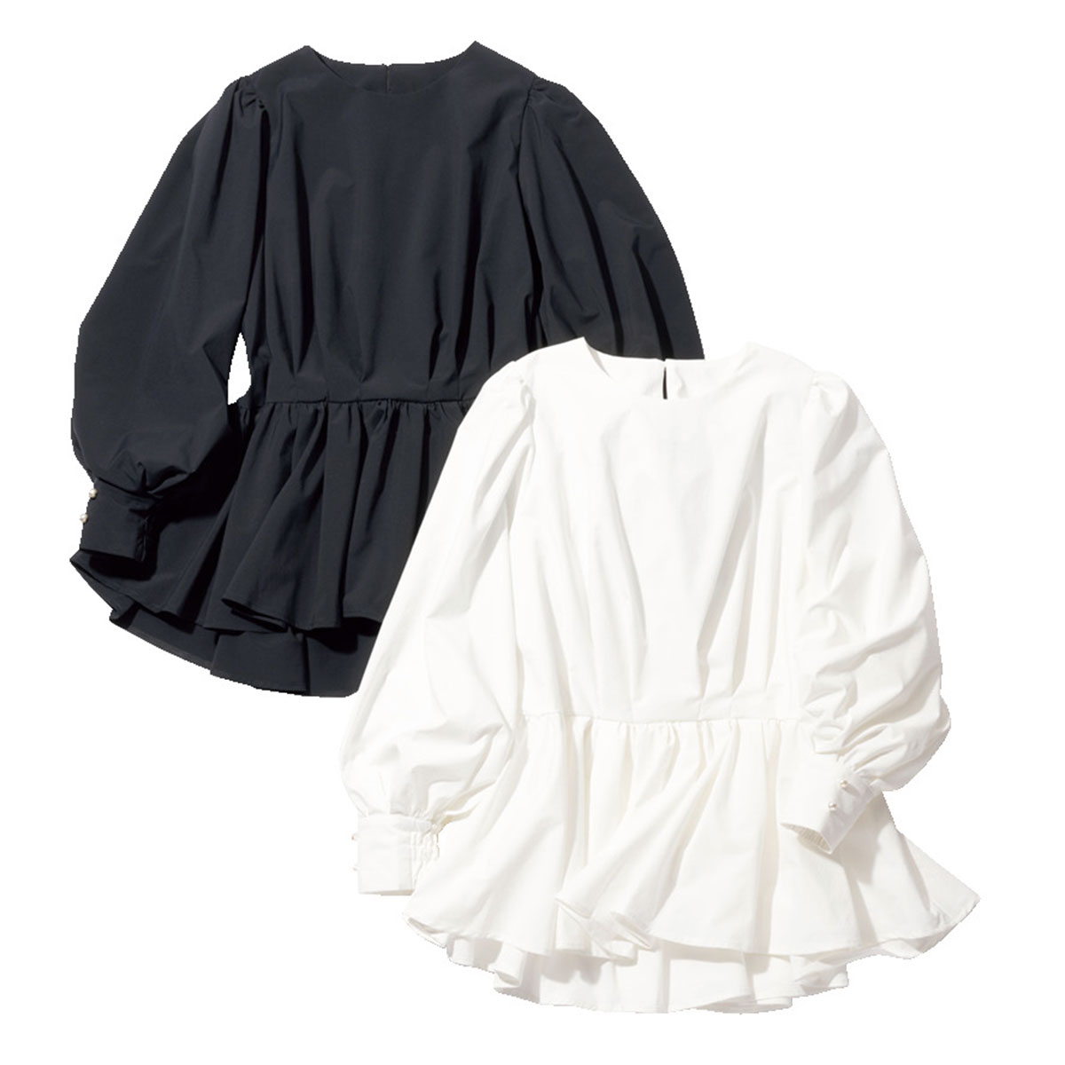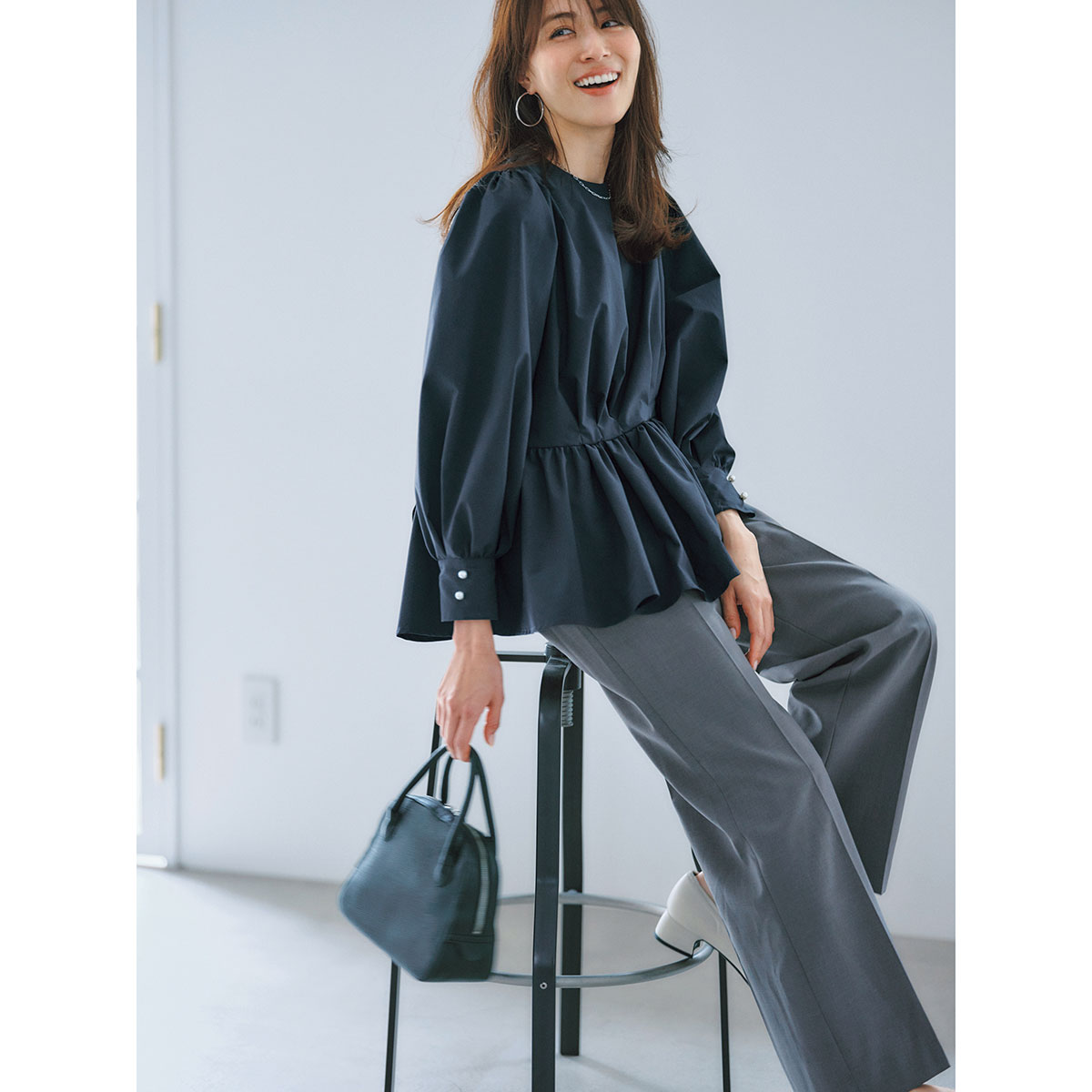 タックとギャザーを組み合わせたペプラムが、甘さを抑えつつ奥行きのある表情を演出。袖口にはパールボタンを配し、手元にさりげない上品さを。ヒップまで届く丈感も体形カバー。