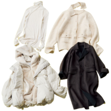 表情のあるポップコーン編みニットに、ハリ感のあるタフタをドッキング。セットインスリーブできちんと感を持たせ、メタルボタンが全体を引き締めるアクセントに。