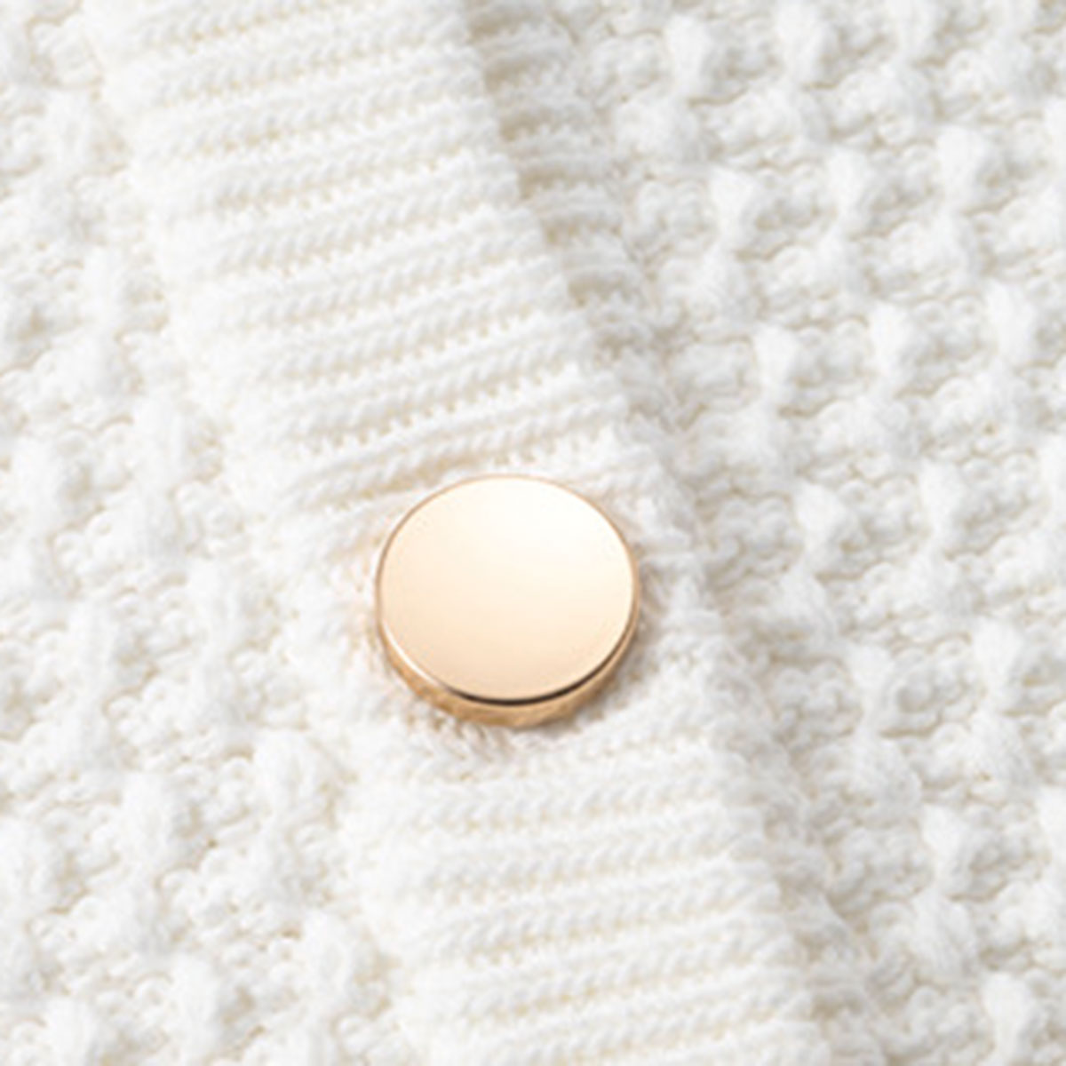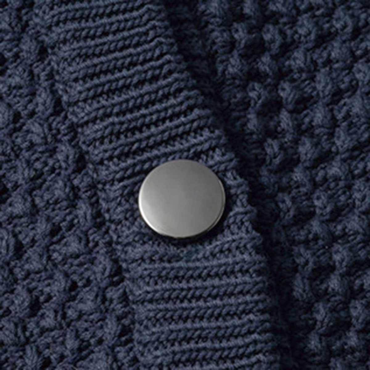 ポコポコとした凹凸が特徴のポップコーン編みは、カジュアルコーデにもすんなりマッチ。デニムやスニーカーと合わせてもラフになりすぎず、キレイめカジュアルが完成します。前を開けて着れば軽い羽織りとしても活躍。ネイビーのボタンはガンメタリック系。