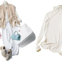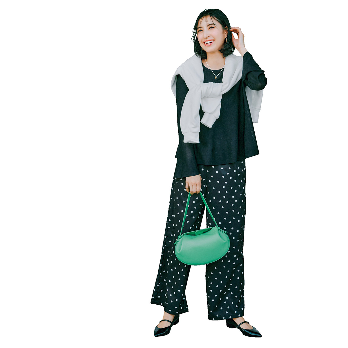トップス¥8,910(エルド)肩にかけたスウェット¥15,400(ハチイチブランカ╱UTS PR)パンツ¥8,990(アンフィーロ)バッグ¥49,500(リンレザー)パンプス¥18,150(ダイアナ╱ダイアナ 銀座本店)ピアス¥18,700ネックレス¥122,000(ともにチビ・ジュエルズ╱チビジュエルズ・ジャパン)リング¥50,380(ソコ╱ZUTTOHOLIC)