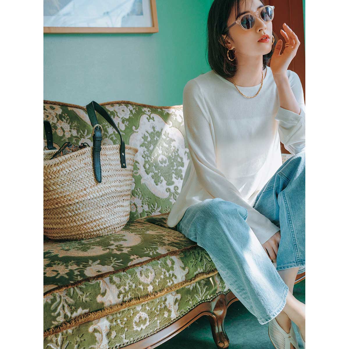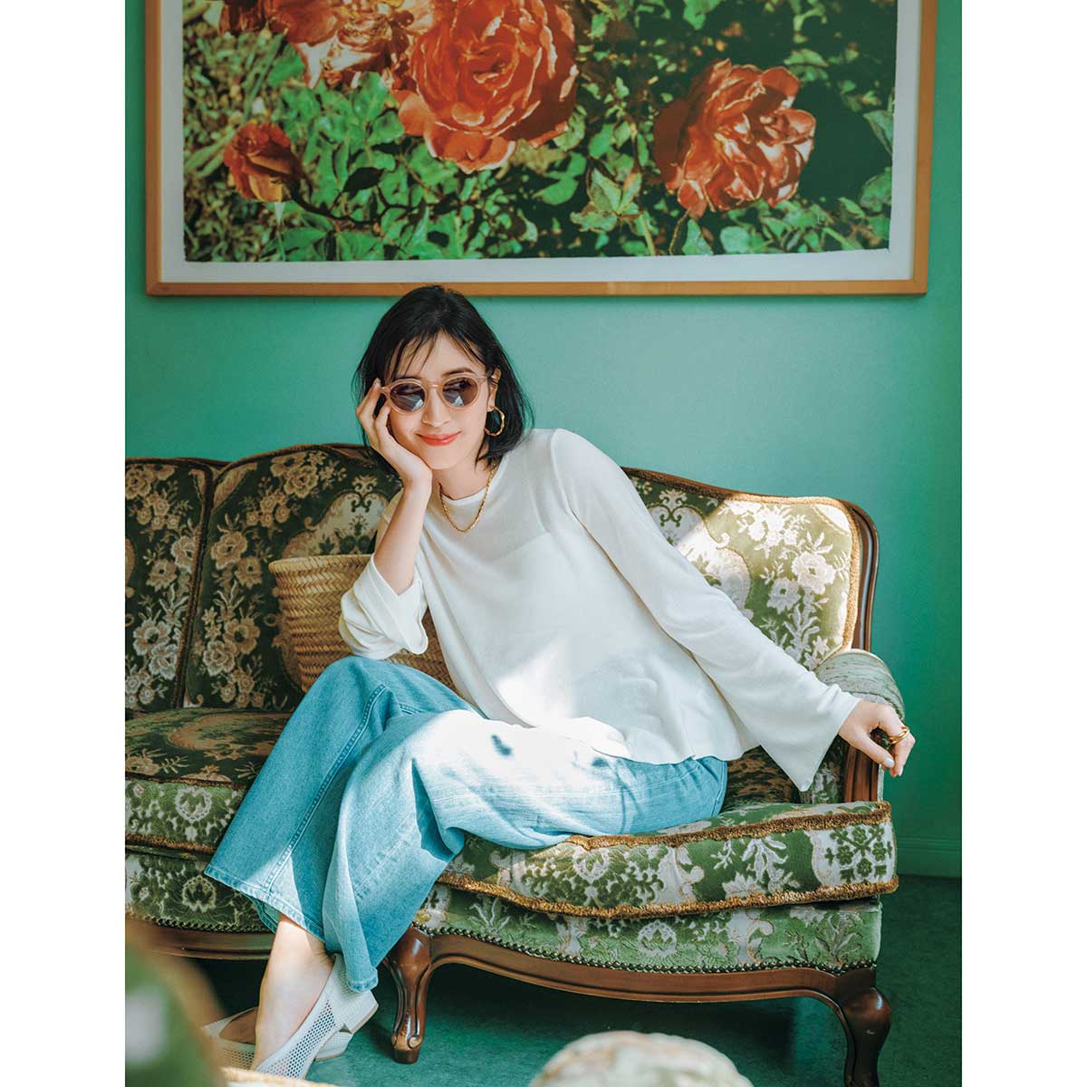 トップス¥8,910(エルド)デニムパンツ¥30,800(ヤヌーク╱カイタックインターナショナル)バッグ¥12,980(ペルケ╱アンビリオン)パンプス¥16,500(ダイアナ╱ダイアナ 銀座本店)サングラス¥47,300(アイヴァン╱アイヴァン 東京ギャラリー)ピアス¥28,380〈ソコ〉リング¥9,460〈フル・オブ・グレイス〉(ともにZUTTOHOLIC)ネックレス¥43,200(アビステ)