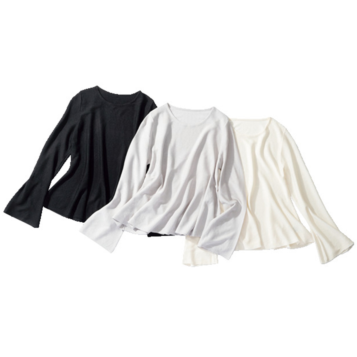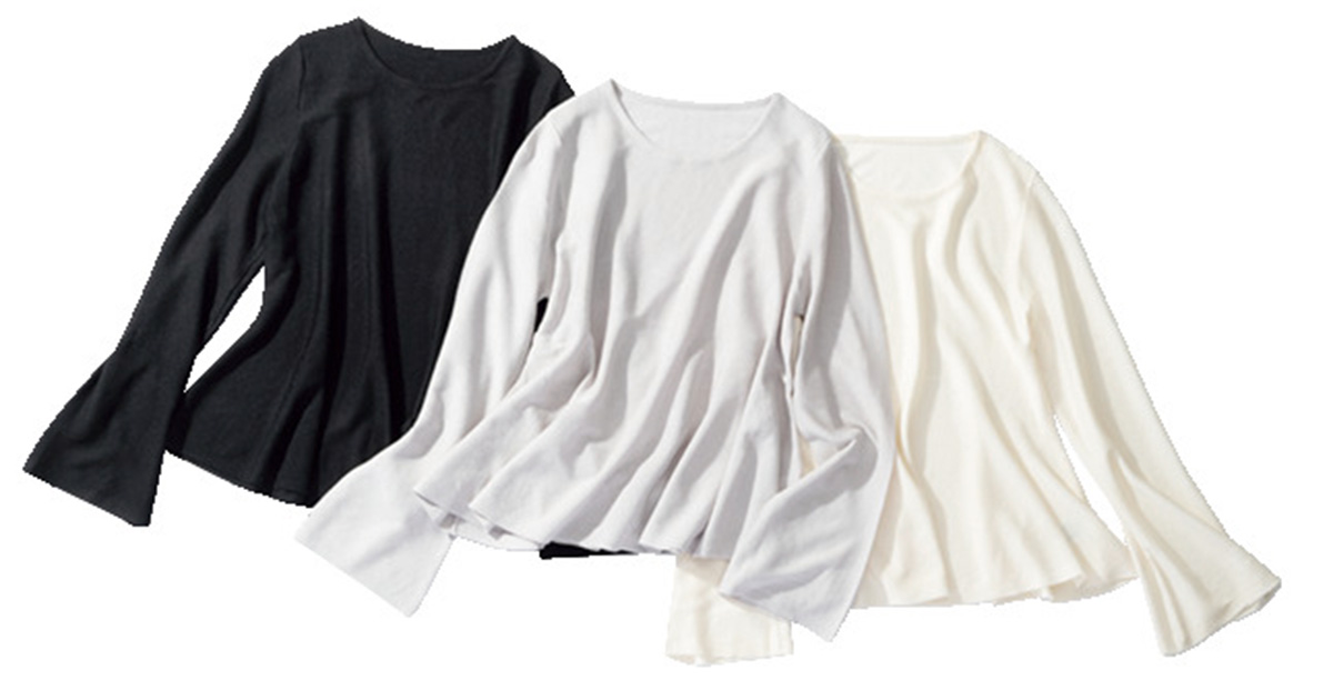 トレンドのシースルーデザインを採用した薄手ニット。身頃・袖ともに緩やかに広がるフレアシルエットで、着痩せと着映えを両立。水洗い可。