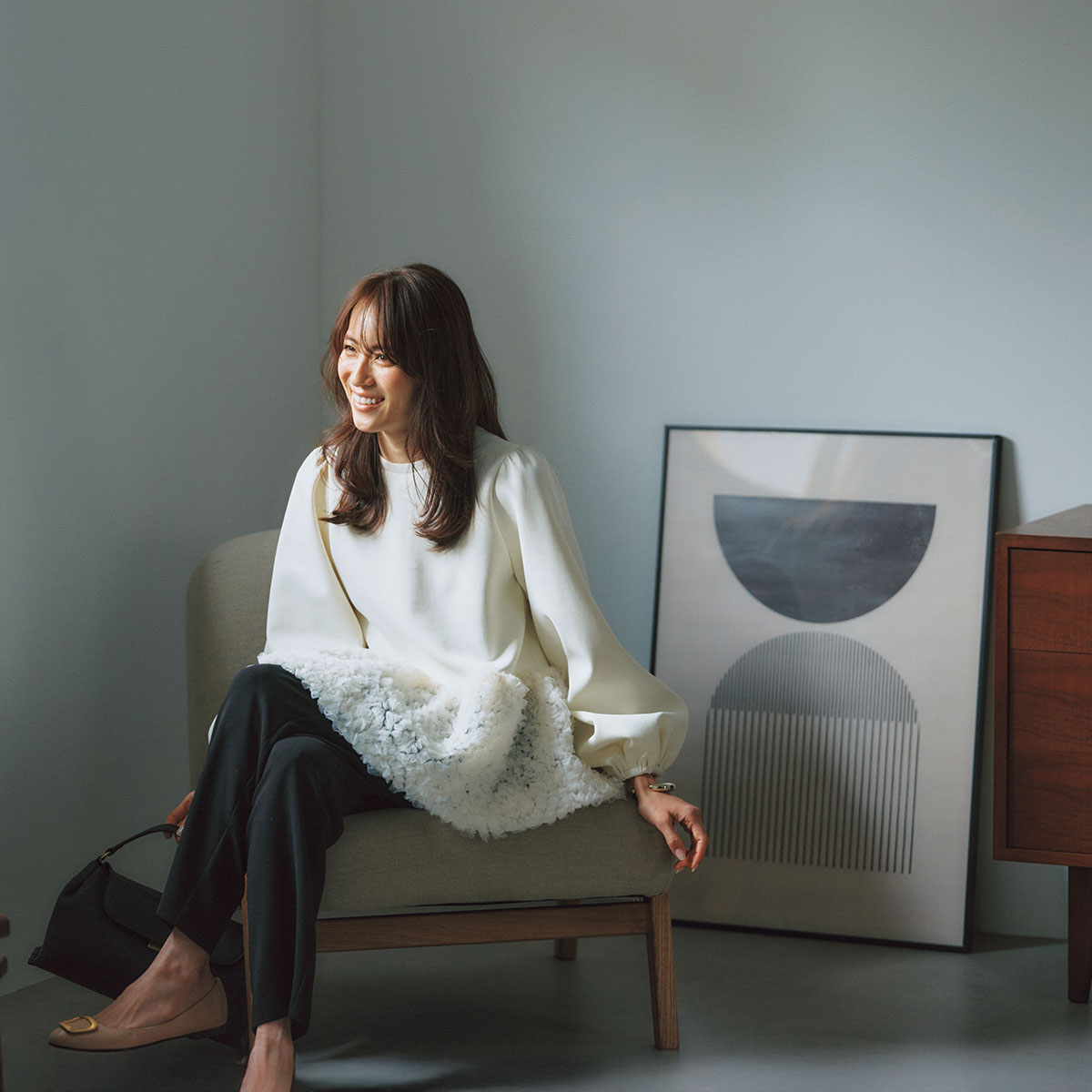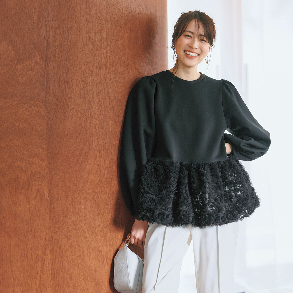 プルオーバー¥19,800(スリースクエア)パンツ¥17,600(デミルクス ビームス/デミルクス ビームス 新宿)バングル¥13,750(エイチアッシュ/フォーティーン ショールーム)バッグ¥52,800(TOV/アンソロジー)パンプス¥38,500(ファビオ ルスコーニ/伊勢丹新宿本店 本館2階 婦人靴)