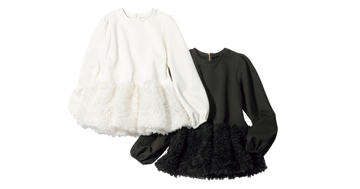 スエットではもう暑いけどまだ肌寒さの残る時季から活躍するのが長袖ジャージー。レースのような立体感のあるチュールのふんわりとしたペプラムシルエットが、気になる腰まわりを自然にカバーします。
