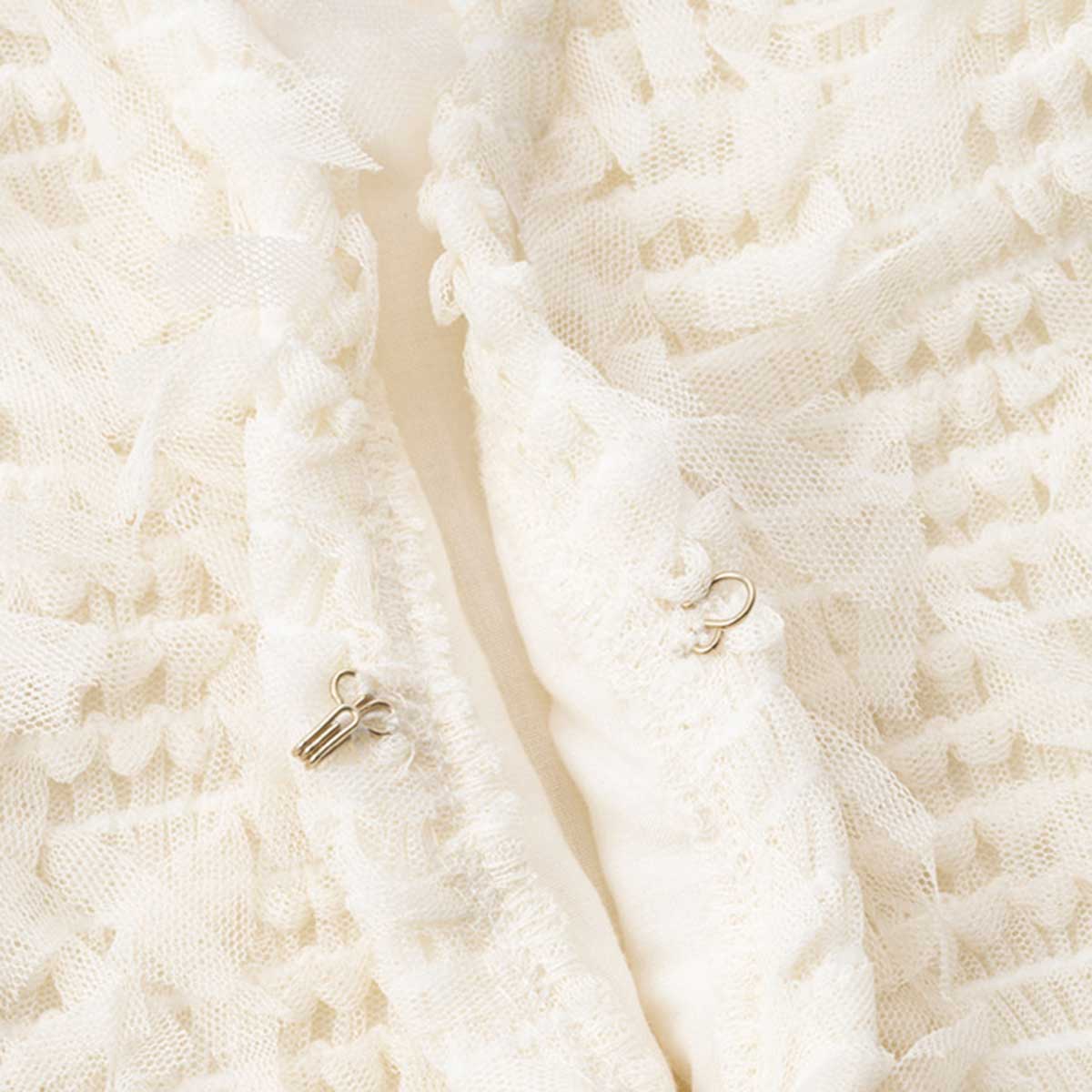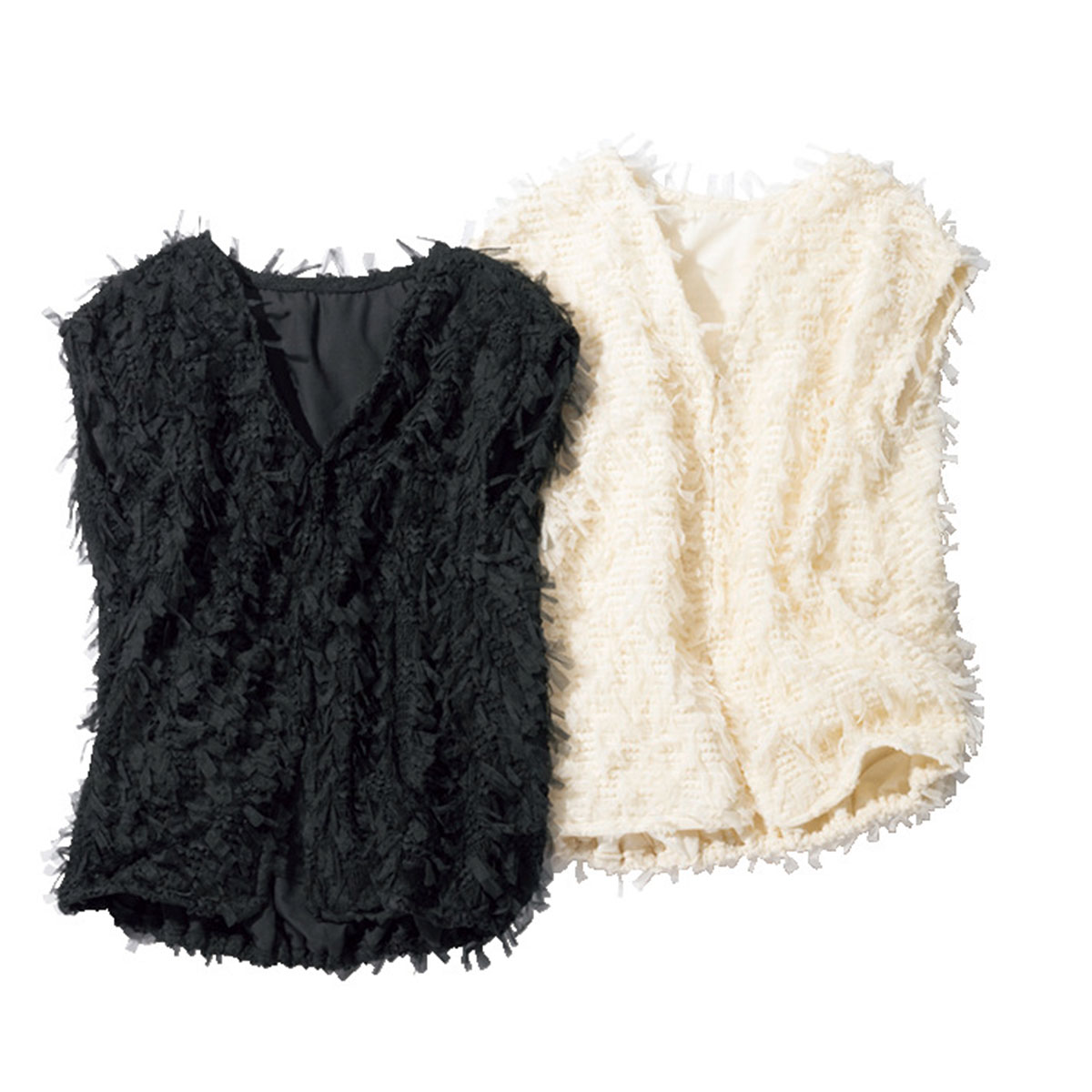 リボンヤーンを織り込んだ表情豊かな素材を採用。Vネックで顔まわりはすっきり。肩にほんのりかかる設計で華奢見えを叶えます。フロントは前開き仕様で、ホックで閉じることも可能。