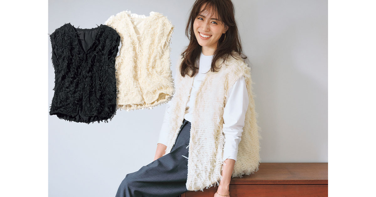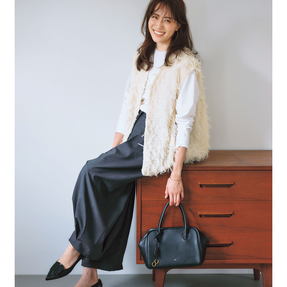 ジレ¥19,800(スリースクエア)パンツ¥39,600(エス/sense)ピアス¥4,950〈エフ.シークエンス〉バングル¥86,900〈モニス〉(ともにフォーティーン ショールーム)バッグ¥53,900(TOV/アンソロジー)シューズ¥34,100(ファビオ ルスコーニ/伊勢丹新宿本店 本館2階 婦人靴)その他/スタイリスト私物