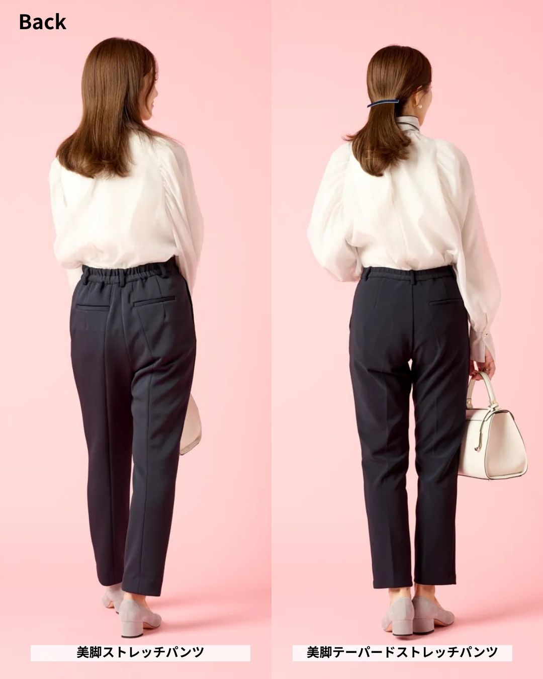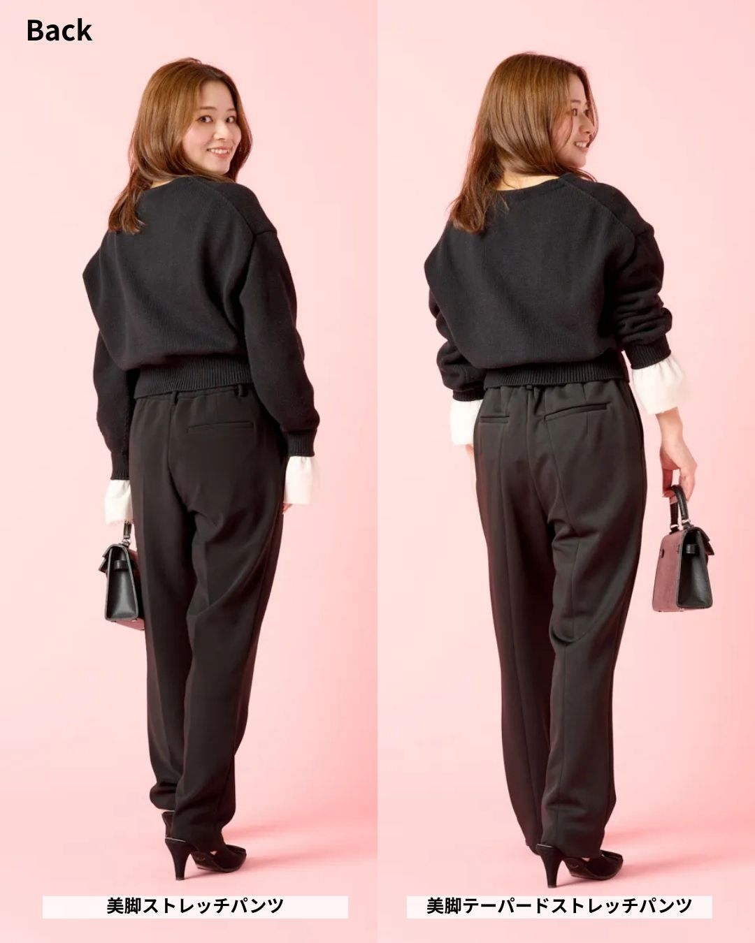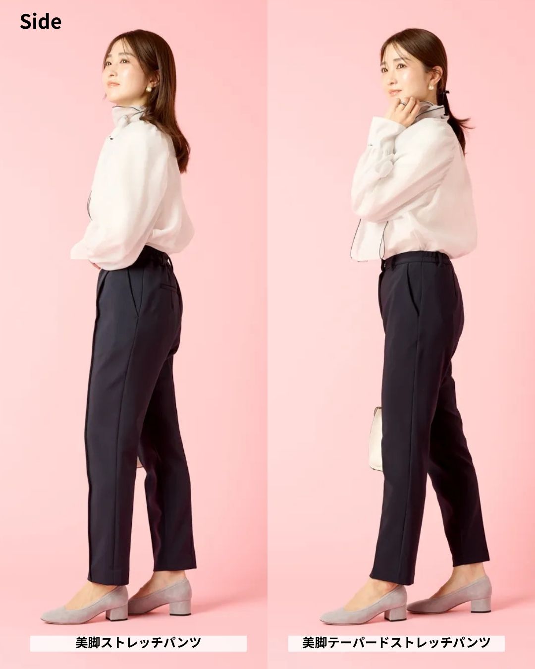 “美脚パンツ”とスタッフの間でも高評価の2本を徹底比較。美脚テーパードスリムパンツ(上)、美脚ストレッチパンツ(下)を重ねてみました。