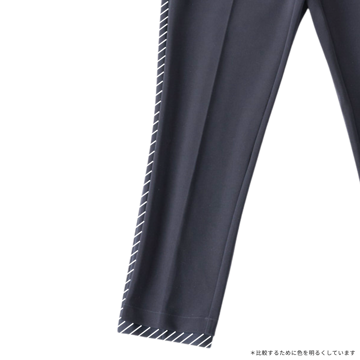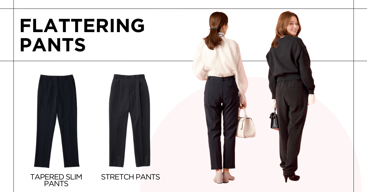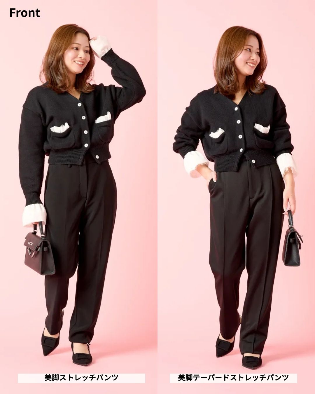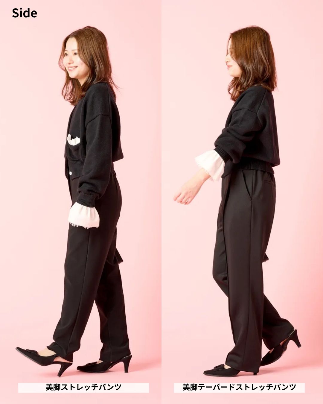 “美脚パンツ”とスタッフの間でも高評価の2本を徹底比較。美脚テーパードスリムパンツ(上)、美脚ストレッチパンツ(下)を重ねてみました。