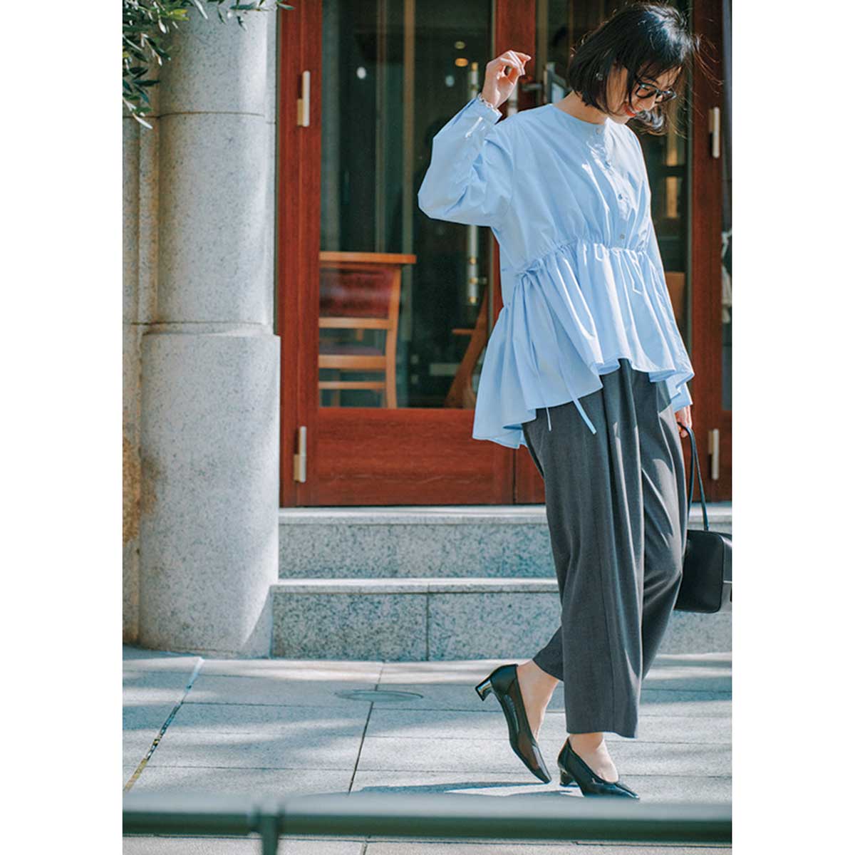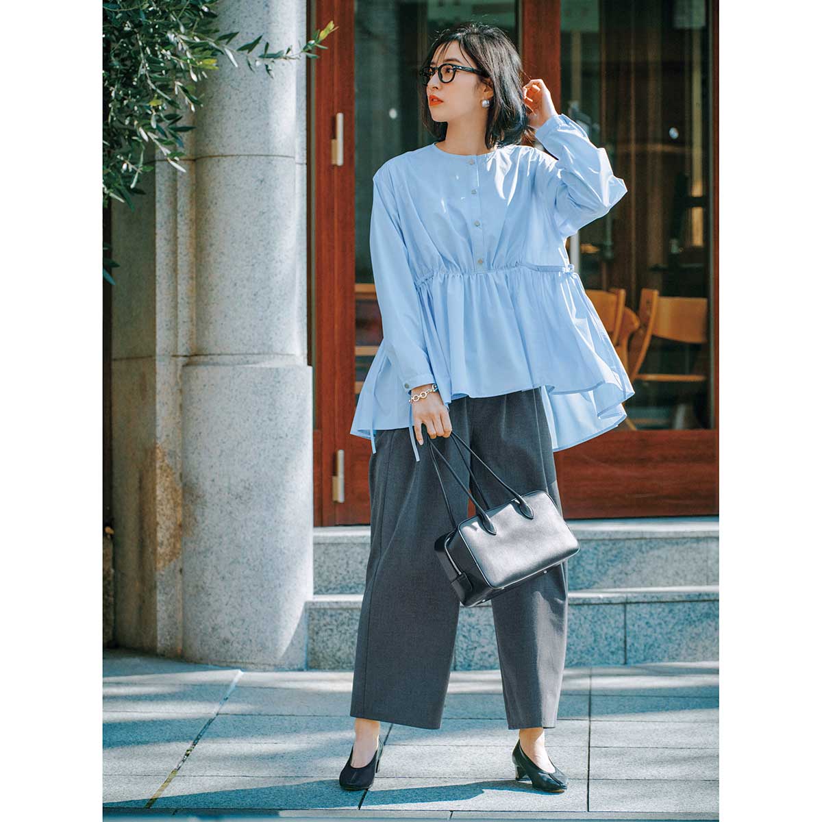 ブラウス¥17,600(アレグレ)パンツ¥22,000(ホワイト)バッグ¥86,900(メゾン カナウ╱ヤマニ)パンプス¥17,600(ダイアナ╱ダイアナ 銀座本店)めがね¥49,500(モスコット╱モスコット アオヤマ)ピアス¥26,620〈バルブス〉ブレスレット¥18,700〈アドラル〉(ともにZUTTOHOLIC)