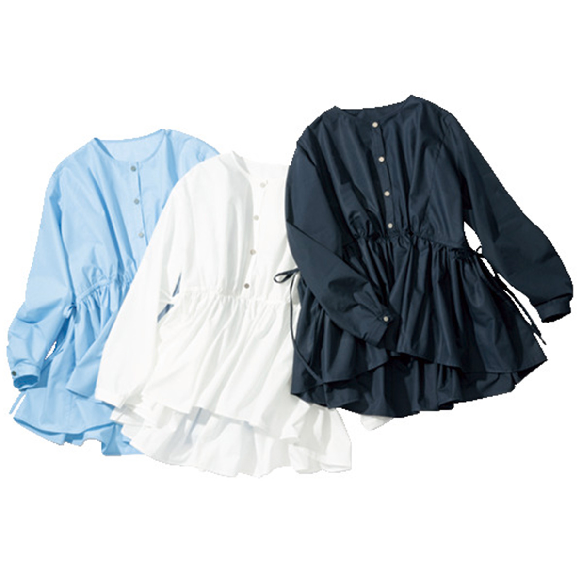 サイドのドローコードを絞ればメリハリのあるペプラムに、緩めればドラマチックなテントラインを楽しめるだけでなく、腰位置高めのリボンが視線を上げ、自然とスタイルアップ。ノーカラーで首元はすっきり。サックスは甘くなりすぎず爽やかに映える大人の春色。速乾性がありシワになりにくい素材なので、忙しい朝も安心。