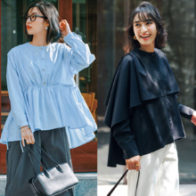 タックとギャザーを組み合わせたペプラムが、甘さを抑えつつ奥行きのある表情を演出。袖口にはパールボタンを配し、手元にさりげない上品さを。ヒップまで届く丈感も体形カバー。