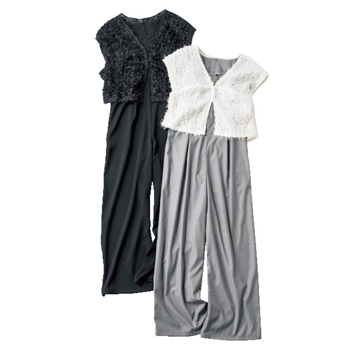 セットで着るだけでコーデが完成する、華やかさと実用性を両立したセットアップ。ボレロは立体感のある素材が視線を引き上げ、オールインワンはハイウエストの切り替えとすっきりしたシルエットでスタイルアップ効果も抜群。春先はロンTやリブニットを重ねて、夏は一枚でさらりと。