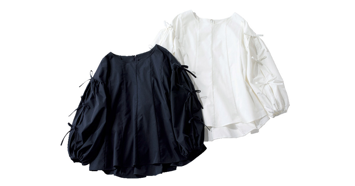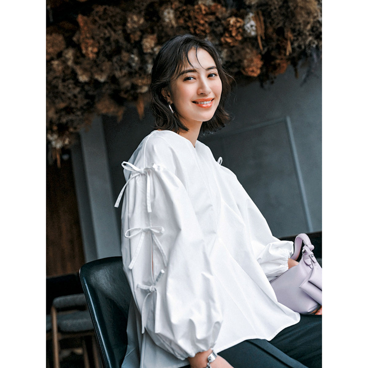 袖外側のスリットに細リボンをあしらった今季らしいブラウス。共布の細リボンだから甘くなりすぎず、大人が取り入れやすいバランスに。ボートネックで首元はすっきり見え。